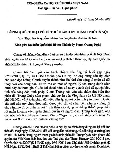 Nay chúng tôi đề nghị có buổi đối thoại với Quý ông trên cương vị là Bí thư Thành ủy thành phố Hà Nội, người đứng đầu tổ chức Đảng, hệ thống chính trị, bộ máy Nhà nước của thành phố Hà Nội, và là Đại biểu Quốc hội thuộc Đoàn Đại biểu Quốc hội thành phố Hà Nội...