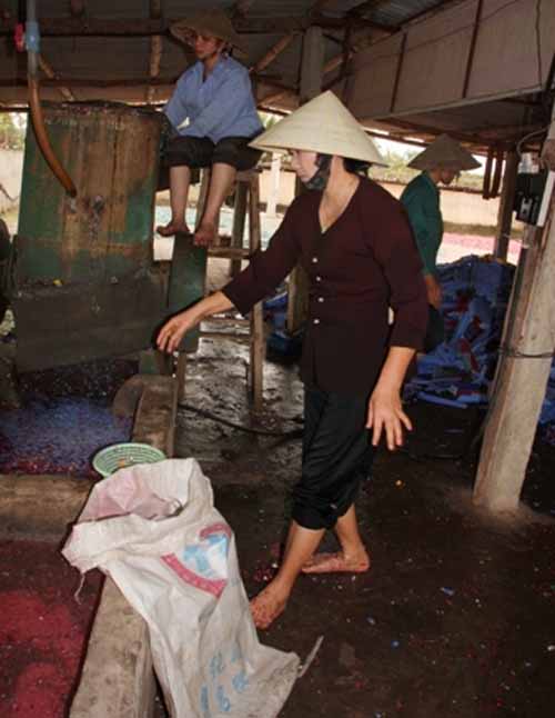 Mặc dù đã biết trước nhưng tôi vẫn khá bất ngờ khi nhìn thấy bà Thuỷ - một phụ nữ khoảng ngoài năm mươi. Bà đi chân đất giữa những công nhân đang đi ủng hoặc đi giày dép.