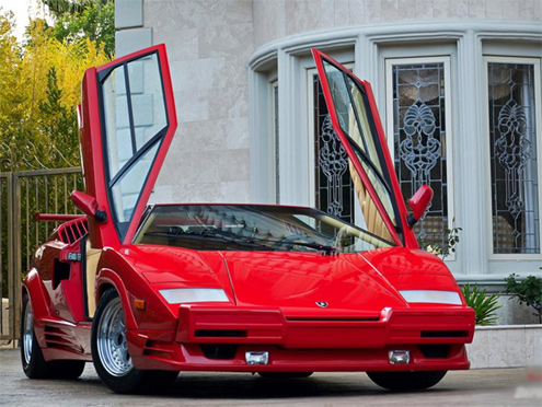 Lamborghini Countach được sản xuất từ năm 1974 đến 1990 và sử dụng động cơ V12. Bên cạnh là Ferrari 458 Italia màu đen.