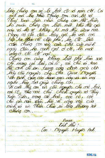 Chúng con cũng không biết phải làm sao, chỉ mong các cô các chú và toàn thể anh chị em trong cộng đoàn giáo dân và những người thiện chí trên toàn thế giới hãy cầu nguyện cho Cha Giu-Se Nguyễn Văn Bình qua cơn hoạn nạn này và xin mọi người hãy trợ giúp chúng con Và cuối thư con xin cầu nguyện cho các bác, các cô, các chú của chính quyền xã Thủy Xuân Tiên, mong các bác, các cô, các chú ăn năn sám hối về công việc của mình và xin Thiên Chúa rủ lòng thương xót chúng con.