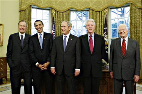 | Bức ảnh chụp 5 đời Tổng thống Mỹ tại buổi họp mặt đặc biệt ở Pḥng Bầu dục ngày 7/1/2009. Từ trái sang: Bush-cha, Obama, Bush-con, Clinton, Carter. Ảnh: Time |