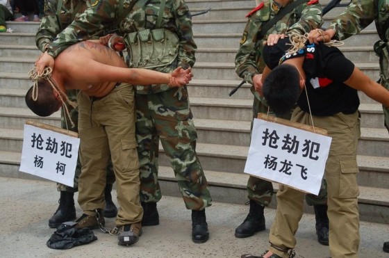 - Hôm 13/5, hai tên cướp tiệm vàng ở tỉnh Thiểm Tây đã bị sa lưới và bị công an địa phương đeo biển “ăn trộm” cùng họ tên lên cổ và dẫn giải đi khắp phố cho người dân chứng kiến.