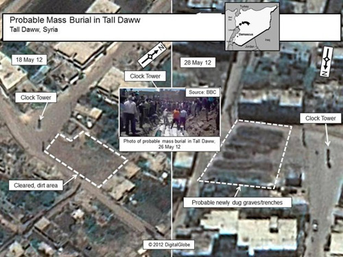 Website humanrights.gov thuộc Bộ Ngoại giao Mỹ cho biết, hàng loạt bức ảnh chụp từ vệ tinh thương mại hồi đầu tuần đã cho thấy, nhiều mồ chôn tập thể đã được hình thành sau vụ thảm sát 108 người ở thành phố Houla đêm 25/5 vừa qua.