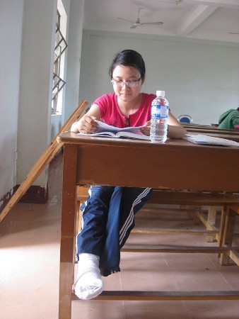 Nén đau, Minh tranh thủ ôn bài trước khi vào phòng thi( Ảnh: Nguyễn Thị Muội)