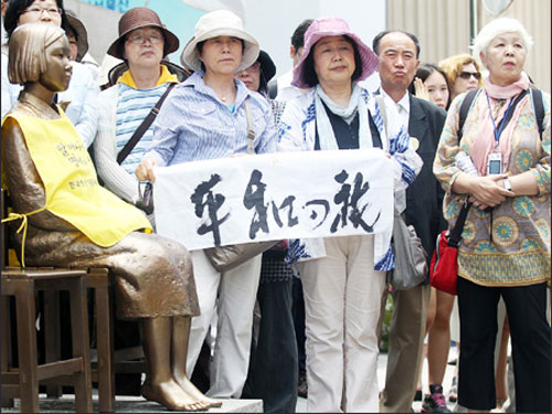 10 phụ nữ Hàn Quốc kiện ông Suzuki tội sỉ nhục đứng cạnh bức tượng đồng vào tháng 6-2012. Ảnh: Yonhap