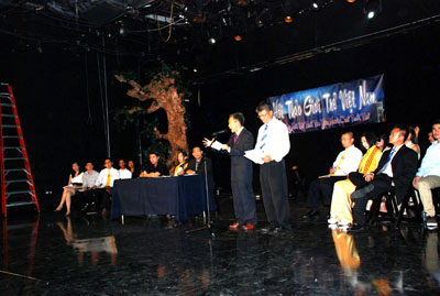 Ký giả Trương Minh Ðức từ Việt Nam qua điện thoại viễn liên góp tiếng nói trong cuộc hội thảo. (Hình: Nguyên Huy/Người Việt)