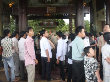 Đến 16 giờ cùng ngày, hàng chục người vẫn c̣n chen chúc tại các cửa ra vào mong được lương y Vơ Hoàng Yên chữa bệnh.