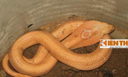 Một lúc sau, anh Chiến đưa chúng tôi ra phía sau diện kiến "ma tổ". Thùng phuy được anh khóa rất cẩn thận v́ theo anh, bọn trộm đă từng ṃ tới với ư định bắt "rắn thần" đi bán. Khi chiếc nắp được mở ra, "ma tổ" là một con rắn màu hồng, dài khoảng 1,3m và nặng 1,5kg. Xác định ban đầu cho thấy, đây là con rắn thuộc ḍng hổ mang, cực độc, trên đầu rắn có h́nh quả trám rất rơ rệt.