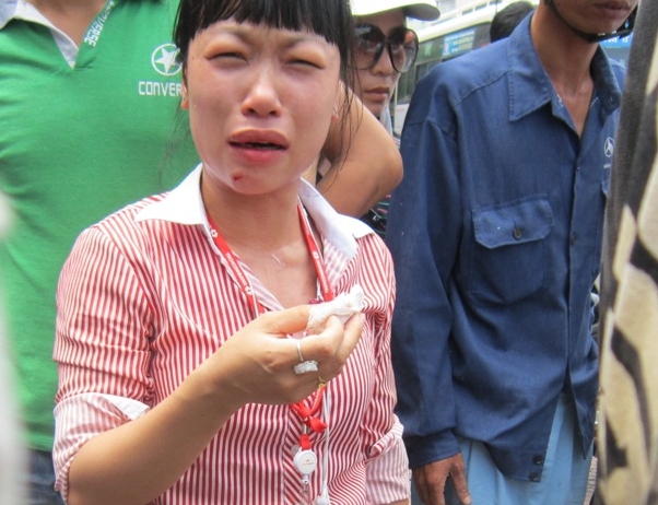 Nạn nhân Nguyễn Thị Thu Phương bị hành hung chảy máu mồm, mặt mũi sưng húp.