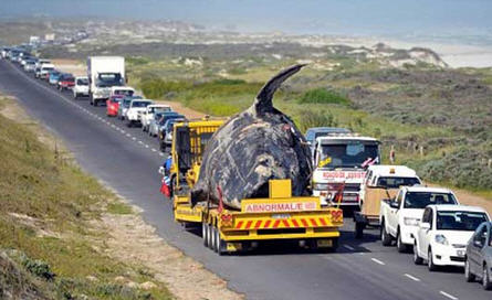 Cá voi "đi dạo" trên đường cao tốc Nam Phi.Thay vì xẻ thịt con cá để đưa tới nơi chôn cất, các nhà chức trách Nam Phi quyết định di chuyển xác con vật khổng lồ trên chiếc xe tải hạng nặng dọc theo một tuyến đường đông đúc của Nam Phi. Choán gần hết diện tích khoang chở hàng của chiếc xe đầu kéo, con vật thu hút mọi ánh mắt ở mọi nơi nó đi qua vì không hề được che phủ.