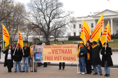Ðồng hương Việt Nam trước Tòa Bạch Ốc, tham gia chiến dịch ký thỉnh nguyện thư yêu cầu chính quyền Mỹ can thiệp cho nhạc sĩ Việt Khang, hồi Tháng Ba. (Hình: Ðỗ Dzũng/Người Việt)