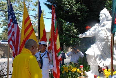 Tượng danh tướng Trần Hưng Đạo được cựu binh sĩ Hải Quân VNCH dựng trong khuôn viên chùa Bát Nhă, Santa Ana. Trong h́nh là Ḥa Thượng Thích Nguyên Trí, viện chủ chùa Bát Nhă, làm lễ đặt tượng. (H́nh: Nguyên Huy/Người Việt)