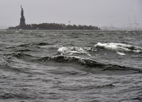 Sóng dâng cao xung quanh tượng Nữ thần Tự do ở New York - Ảnh: AFP