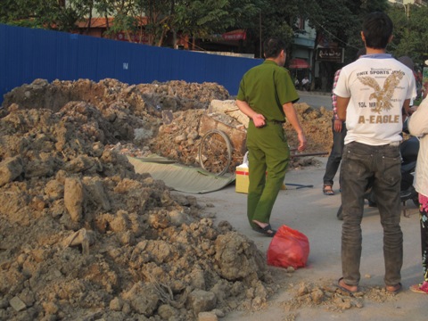 Tại hiện trường, người đàn ông xấu số trên khoảng 40 tuổi, người gầy, da ngăm đen, cao khoảng 1m60, nằm cạnh đống đất tại công trường.