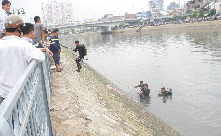 Nhận tin báo,lực lượng Cứu hộ cứu nạn Công an TP.HCM đã có mặt và hơn 1 giờ sau thì đưa được thi thể em Trọng lên bờ.