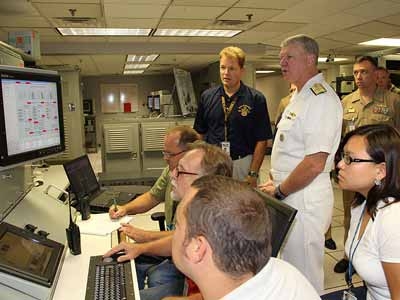 | Quan chức Quốc pḥng Mỹ xem xét hệ thống điện tích hợp. Ảnh: Joseph Battista. |