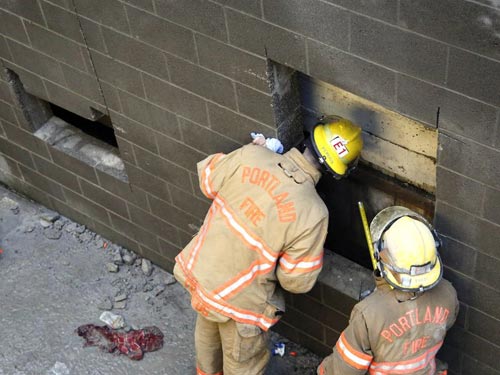 Các nhân viên cứu hỏa đã phải cắt 1 lỗ xuyên tường, sử dụng túi khí và xà phòng để giải cứu 1 phụ nữ ngã vào khe hẹp giữa 2 tòa nhà tại thành phố Portland, bang Oregon (Mỹ) hôm 16-1.