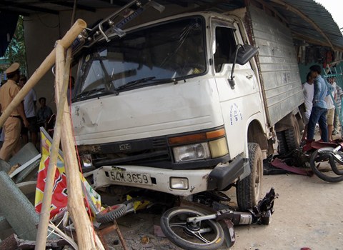 | | Chiều 28/1, ôtô 1,5 tấn chạy trên đường ĐT 741, hướng từ ngã tư Sở Sao đi huyện Phú Giáo (Bình Dương). Khi đến gần cửa hàng quần áo thời trang Toàn Linh (xã Hòa Lợi, huyện Bến Cát, Bình Dương), xe mất lái, lao thẳng vào vách tường cửa hàng... |  | | ... húc đổ tủ kính trưng bày quần áo. |  | | Ôtô tiếp tục lao qua tiệm sửa xe kế bên, cán bẹp 3 xe máy dựng phía trước. Rất may 3 người đang ăn cơm đã kịp nhảy ra ngoài trước khi xe tải tông thẳng vào bộ bàn ghế bằng đá họ đang ngồi. |  | | Gây tai nạn xong, lái xe rời bỏ khỏi hiện trường. Chiều cùng ngày, Công an huyện Bến Cát có mặt điều tra nguyên nhân. |  | | “Chúng tôi đang ngồi ăn cơm thì thấy chiếc xe loạng choạng lao nhanh về phía mọi người. Chỉ kịp la lên, kéo nhau bỏ chạy thoát thân nhưng vẫn bị mảnh vỡ gạch, kính văng trúng người chảy máu", chị Nguyễn Thị Tuyết Hạnh mặt tái xanh kể lại phút xe tải lao vào các thành viên trong gia đình. |