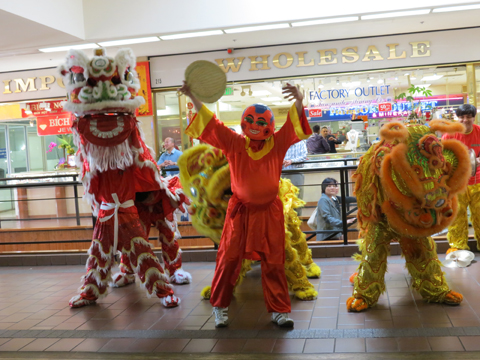 Người Việt buôn bán và mua sắm tại thương xá thích thú với màn múa lân đặc sắc mùa lễ hội.
