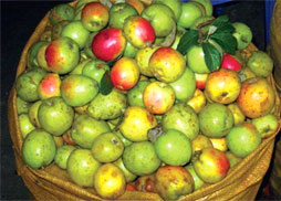 Là một tỉnh nằm ngay cửa ngõ Tây Bắc nên dẫu khí hậu ở đây không thích hợp để trồng nhưng vào mùa, táo mèo chín vẫn được mang từ Sơn La về bày bán khắp các chợ trong thành phố Hòa Bình. Những trái táo mèo chín vàng, thơm quyến rũ, chúng tôi đã biết từ lâu. Ông xã của tôi và bạn bè rất thích uống rượu táo mèo. Theo yêu cầu của chúng tôi, chị Lan dẫn chúng tôi vào chợ Thái Bình (còn gọi là chợ Chăm) mua táo mèo.