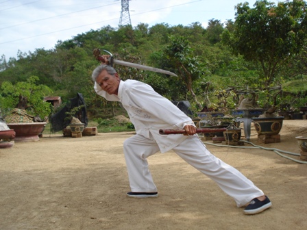 | Lão võ sư Phi Long đang biểu diễn nghiệp kiếm cung |