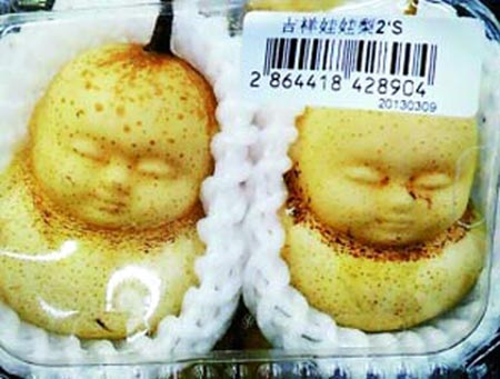 Hộp lê được bán tại siêu thị Bắc Kinh có những trái lê trông giống y như một em bé với đầy đủ mặt mũi.