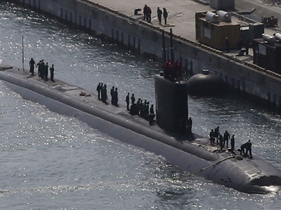 | Tàu ngầm hạt nhân USS Cheyenn của Mỹ đậu tại căn cứ hải quân ở Busan, Hàn Quốc. Ảnh: Reuters. |