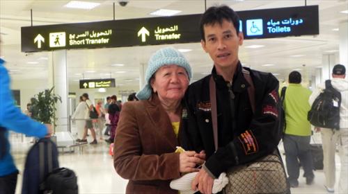 Vợ chồng chị Phượng quá cảnh ở sân bay Doha, Qatar - Ảnh: Quỳnh Trung