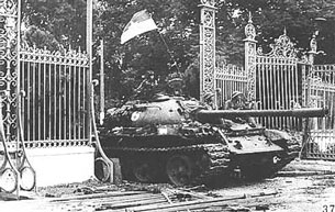 Xe tăng quân đội miền Bắc Việt Nam tiến vào dinh Độc Lập trưa ngày 30-4-1975./PHOTO AFP