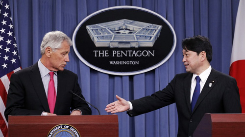 Bộ trưởng Quốc phòng Nhật Itsunori Onodera (phải) thể hiện tinh thần hợp tác với Bộ trưởng Quốc phòng Mỹ Chuck Hagel (Ảnh: Reuters)