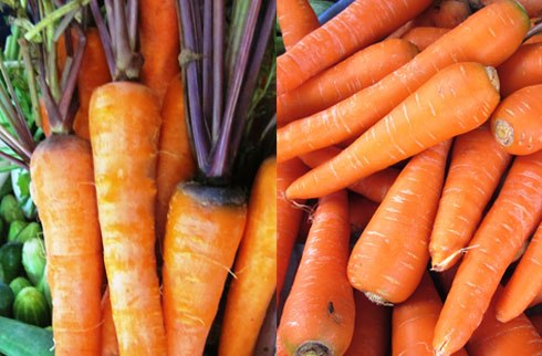 | Cà rốt Đà Lạt (bên trái) da sần, màu cam nhạt, cuống lá còn nguyên, vị ngọt thanh tự nhiên, hiện có giá 22.000 đồng một kg. Ngược lại, cà rốt Trung Quốc (bên phải) da bóng láng, củ to, tròn đều, không cuống, màu cam đậm, vị nhạt, giá 15.000 đồng một kg. |