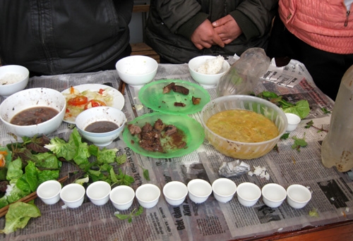 Tôi nhiều lần xuống huyện, được mời đi ăn sáng, trước khi gọi phở hay cháo “chủ nhà” hay gọi trước 1 – 2 chai rượu kèm theo đĩa lòng lợn hay những món nhậu miền rừng. Tất nhiên vẫn phải nâng chén và uống cạn để “hồi” cuộc đêm hôm trước.
