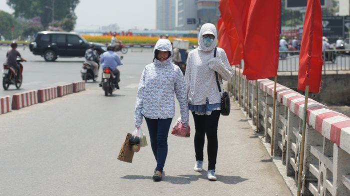 Người dân ra đường đủ kiểu tránh nắng (Ảnh: Hà Minh)