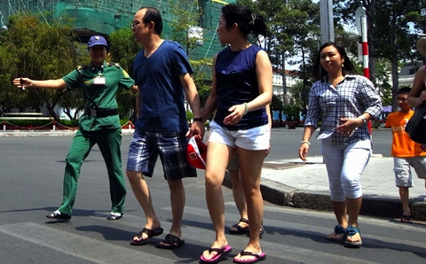 | Trật tự viên (áo xanh) trợ giúp du khách tại TP. Hồ Chí Minh - ảnh: Tuổi trẻ |