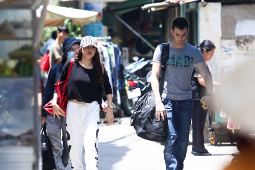 Trưa 16/5, trong cái nắng gay gắt của Sài Gòn, nữ ca sĩ được bạn nhảy Atanas đến tận nhà riêng đón đi ăn. Hot girl "The Voice" đưa chìa khóa xe để chàng trai cầm lái dù anh còn "lóng ngóng" đường phố nơi đây.