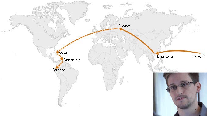Hiện Edward Snowden đã xin tị nạn tại Ecuador và người ta tin rằng chuyên gia máy tính 35 tuổi này vẫn đang ở Nga. Theo BBC, Snowden đã ở trong một khách sạn ở gần sân bay quốc tế Sheremetyevo tại Moscow. Hôm qua trên chuyến bay từ Moscow sang Cuba có một ghế đăng ký tên Edward Snowden nhưng anh đã không lên máy bay.