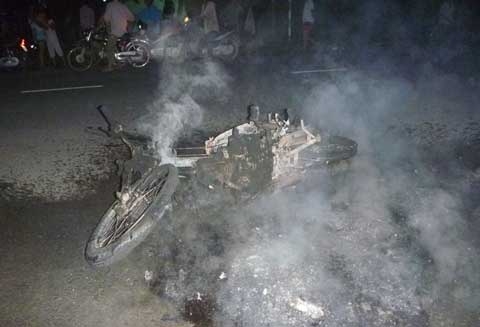 Bất ngờ Hùng rút ống xăng của xe máy BKS 63B3-25.051 và bật lửa lên đốt, nghe tiếng tri hô, bà con 2 bên đường dùng nước để chữa cháy, tuy nhiên ngọn lửa bùng cháy mạnh, thiêu rụi hoàn toàn chiếc xe trong tích tắc.