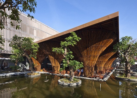 15 cụm tre hình nón được dựng lên để chống đỡ phần mái. Xung quanh là bể nước tạo cảm giác mát lành. Công trình ấn tượng này của kiến trúc sư Võ Trọng Nghĩa đã nhiều lần xuất hiện trên các trang tin nước ngoài chuyên về lĩnh vực kiến trúc.