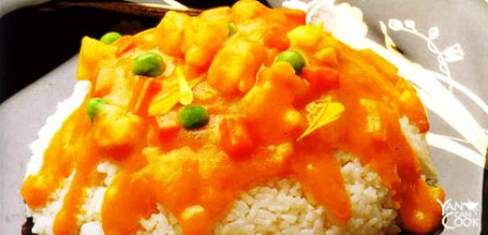4. Đun chảy bơ trong một nồi nhỏ với lửa vừa. Thêm bột mì, quậy đều khoảng 1 phút. Thêm hỗn hợp nước dùng gà, nước cốt dừa, xì dầu, bột cà ri, tiêu trắng vào. Quậy đều, để sôi. Cho hải sản vào, đảo đều, đổ lên cơm.