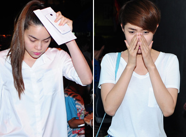 Người đẹp mặc áo trắng và lấy tay che mặt khi các ống kính "di" vào cô.