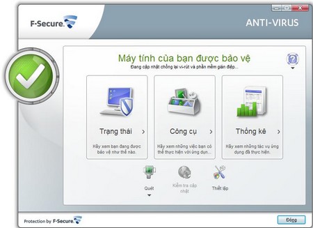 Sau khi hoàn tất các bước cài đặt, F-Secure Antivirus sẽ bắt đầu bảo vệ máy tính của bạn. Với giao diện hoàn toàn bằng tiếng Việt, bạn có thể dễ dàng sử dụng cũng như khai thác các chức năng bảo vệ do phần mềm này cung cấp.