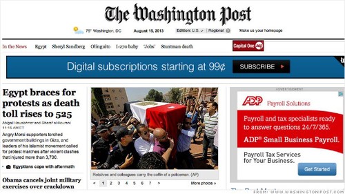 Dịch vụ Outbrain trên website của Washington Post, CNN và Times hôm qua bị tấn công. Ảnh: Washington Post |