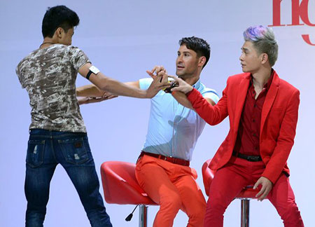 Lúc này, Nam Trung là người ngồi bên cạnh mới nhận ra đây không đơn thuần là cử chị thể hiện tình cảm nữa mà là sự quá kích. Anh đứng bật hẳn dậy và “ra tay” trợ giúp cho Adam lúc đó đang bị túm chặt tay. Lúc này, thí sinh quá khích mới chịu buông nhưng không quên để lại câu chửi tục tỏ thái độ bức xúc khi bị loại.