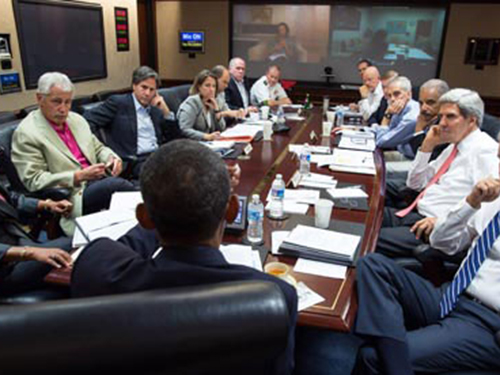 Tổng thống Obama gặp các cố vấn an ninh quốc gia để thảo luận chiến lược về Syria tại Nhà Trắng hôm 31-8 Ảnh: GUARDIAN