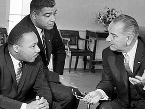 Tổng thống Mỹ Lyndon Johnson (bìa phải) và ông Martin Luther King (bìa trái) cùng cộng sự Whitney Young. Ảnh: AP