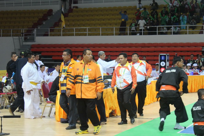 Nhà thi đấu pencak silat tại Khu liên hợp Zeyar Thiri trưa nay đã trở nên hỗn loạn khi tổ trọng tài điều hành trận chung kết giữa VĐV chủ nhà Kyaw Naing Thun gặp Ahmad Shahril (Malaysia) đã thẳng tay thiên vị cho VĐV của chủ nhà.