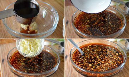 Cho nước tương nhạt, đường nâu, giấm gạo, gừng và tỏi băm nhỏ vào một bát lớn, khuấy đều tất cả cho tan, rồi đặt sang một bên chuẩn bị.