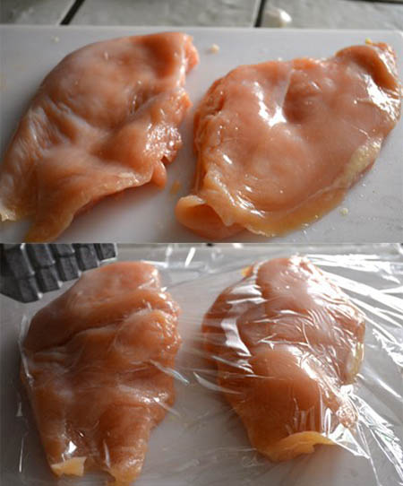 Đặt ức gà trên thớt, phủ một lớp màng bọc thực phẩm lên, và dùng búa đập thịt đập gà cho mềm và mỏng.
