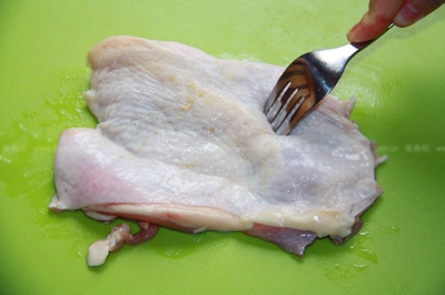- Dùng nĩa đâm đều lên miếng thịt gà. Bước này sẽ giúp thịt gà mềm và ngấm gia vị nhanh hơn.