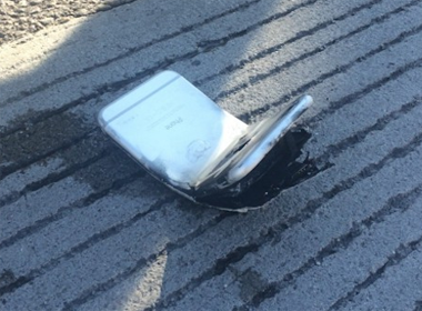 Dù được bảo vệ bằng bao da nhưng chiếc smartphone mới của Apple đã bị biến dạng nặng sau vụ tai nạn khiến pin thủng và phát lửa.